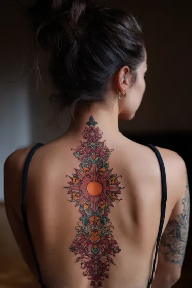 This tattoo is a breathtaking mandala design stretching along the spine, with a radiant orange sun placed at the center. The symmetrical patterns around it feature rich shades of red, teal, and gold, forming ornate floral and geometric details that cascade downward. Every curve and point feels perfectly placed, creating a sense of harmony and balance that makes the tattoo stand out beautifully.