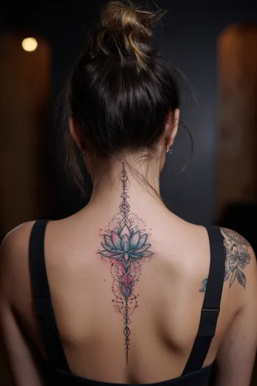 This tattoo showcases a graceful lotus design centered along the spine. The flower opens in shades of teal and soft pink, with fine detailing in the petals that makes it feel alive and delicate. The design is elongated with ornamental patterns above and below the lotus, creating a balanced flow that follows the natural curve of the back.
