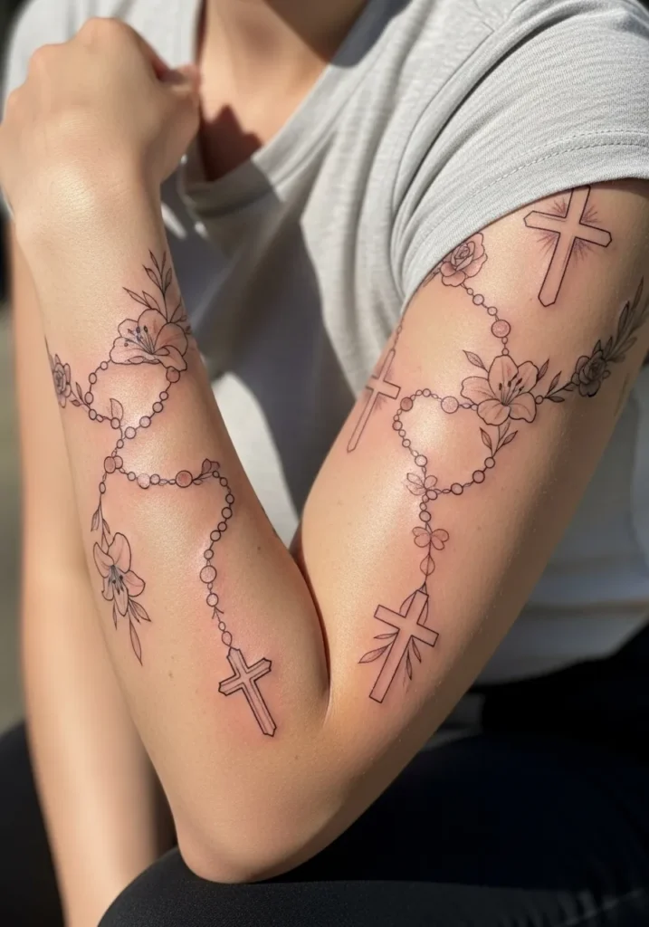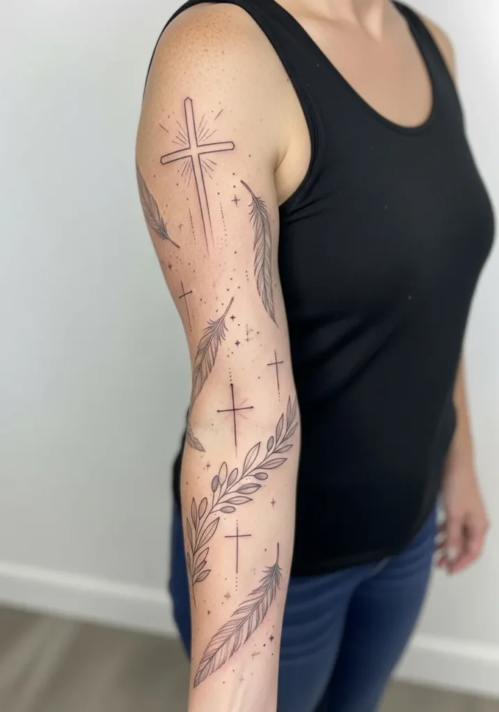 This sleeve runs lightly along the arm with delicate linework crosses, botanical elements, and subtle spiritual symbols.