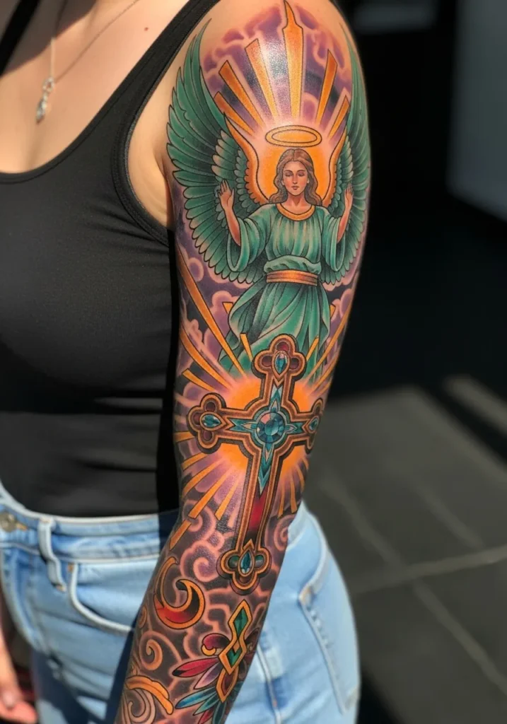 This sleeve combines multiple crosses and faith symbols arranged from shoulder to forearm in a cohesive flow.