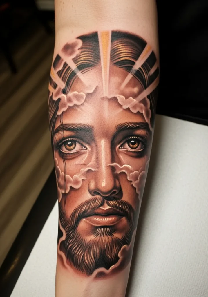 This sleeve features a striking portrait of Jesus along the forearm with dramatic shading and emotional depth.