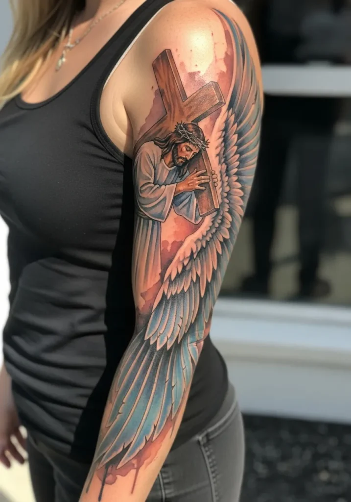 This upper arm sleeve showcases angel wings extending outward from a central cross.