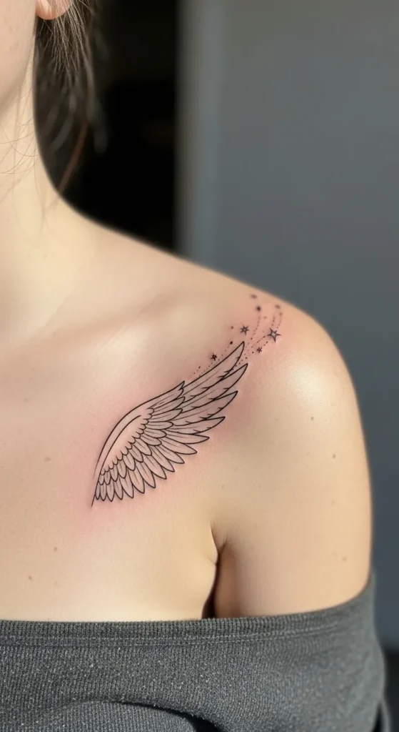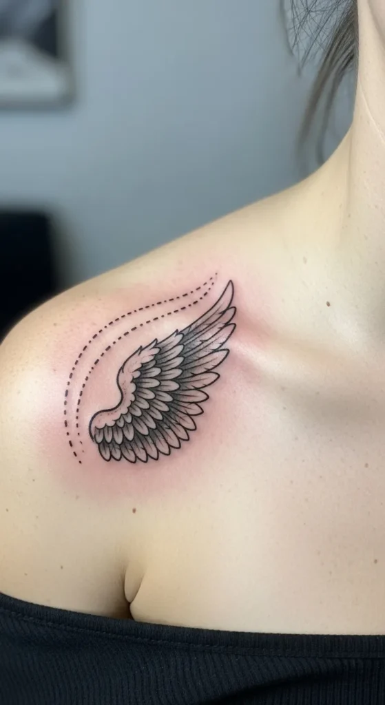The way those little dotted lines mimic a flight path makes me smile because it turns a static image into a story of movement. I find that the placement on the collarbone is such a clever choice since it follows the natural bone structure of the body so well. It feels like a tiny piece of wearable art that manages to be bold enough to notice but quiet enough to stay classy. If you want a wing that feels like it might actually take flight during your morning coffee, then this is a top-tier contender.