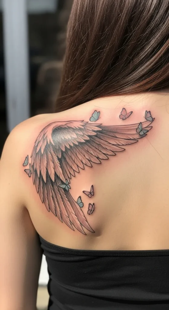 This tattoo takes over the shoulder blade with a sweeping wing that feels like it’s caught in a gentle breeze. The shading uses muted pinks and soft greys to give the feathers a realistic depth without looking heavy or dark. Tiny butterflies in pastel blue and lavender dance around the edges of the wing, which adds a playful touch to the larger piece. It covers a decent amount of skin, but the light colors and thin outlines keep it looking airy and feminine. The way the butterflies trail off toward the spine gives the whole look a sense of flow and life.