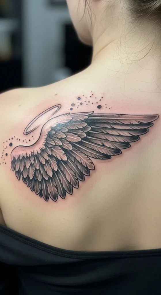 This black-and-grey tattoo stretches across the left shoulder blade and features a single large wing with layered feathers that create a sense of depth. The shading is smooth and transitions from dark edges to lighter highlights at the tips of the feathers. Floating just above the wing is a simple thin halo, while a scattering of tiny dots and small circles drifts around the edges to give it a sense of motion. The placement follows the natural curve of the shoulder and keeps everything in black ink for a timeless look that feels bold yet soft.