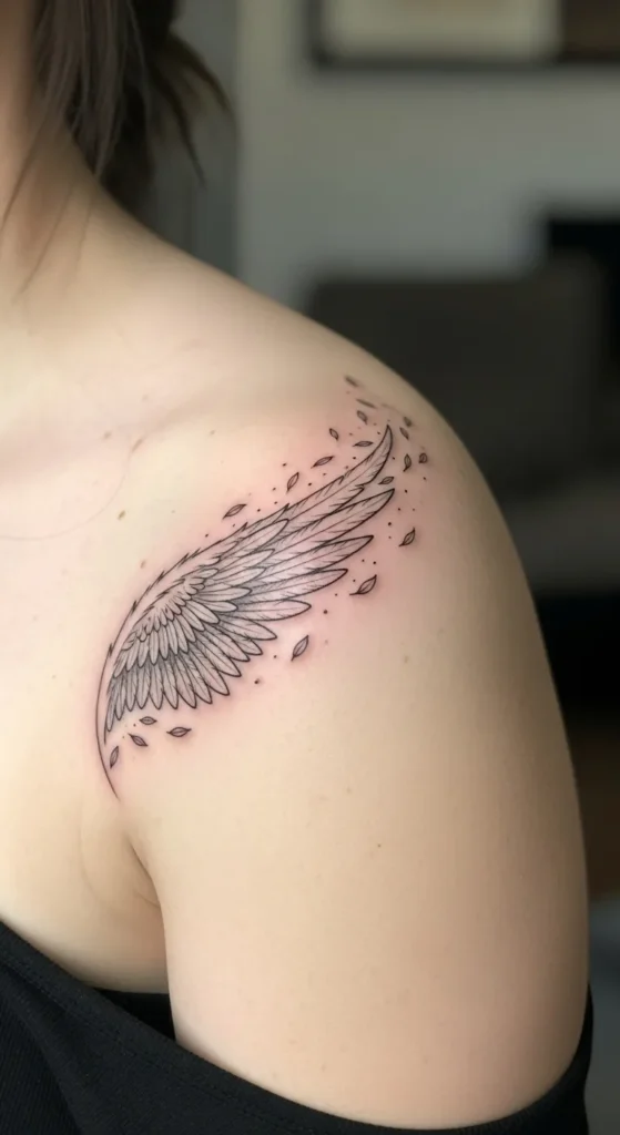 I am a sucker for how this piece feels, both edgy and soft at the same time. The way the feathers seem to catch the light makes it look like they could actually flutter if the person moved. I think choosing the front of the shoulder instead of the back is such a cool move because you get to see it every time you look in the mirror. It feels like a little reminder of strength and freedom that you carry with you throughout the day.