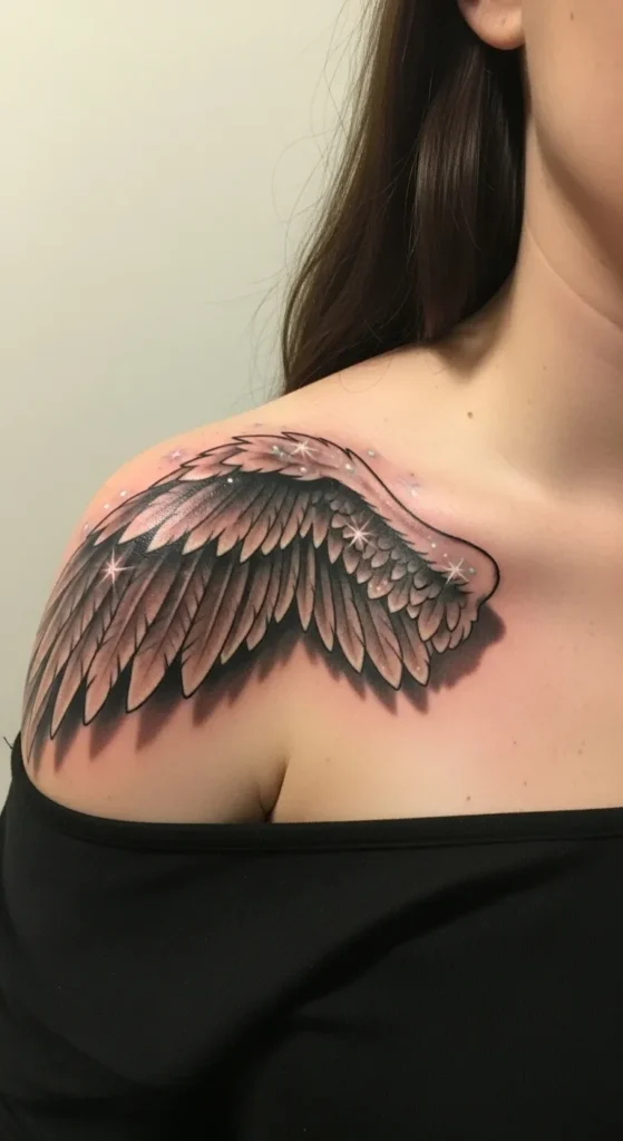 This tattoo wraps over the front of the shoulder and spills toward the collarbone with a mix of soft grey shading and bold white highlights. The feathers have a realistic weight to them, while the dark drop shadow underneath gives the whole wing a 3D effect that makes it look like it is lifting right off the skin. Tiny white sparkles and soft pinkish tones are scattered around the top edge to create a magical atmosphere that feels very modern and fresh. It is a bold choice for a shoulder piece because it uses high contrast to make those delicate glitter details really pop against the skin.