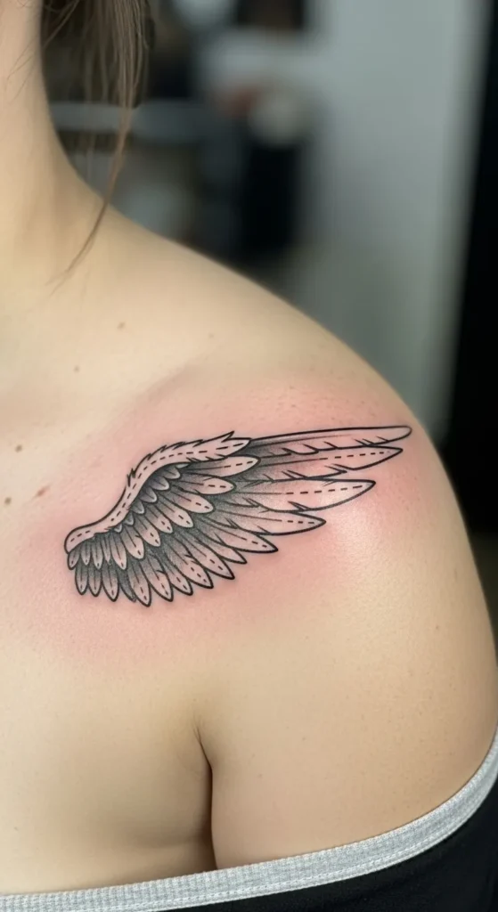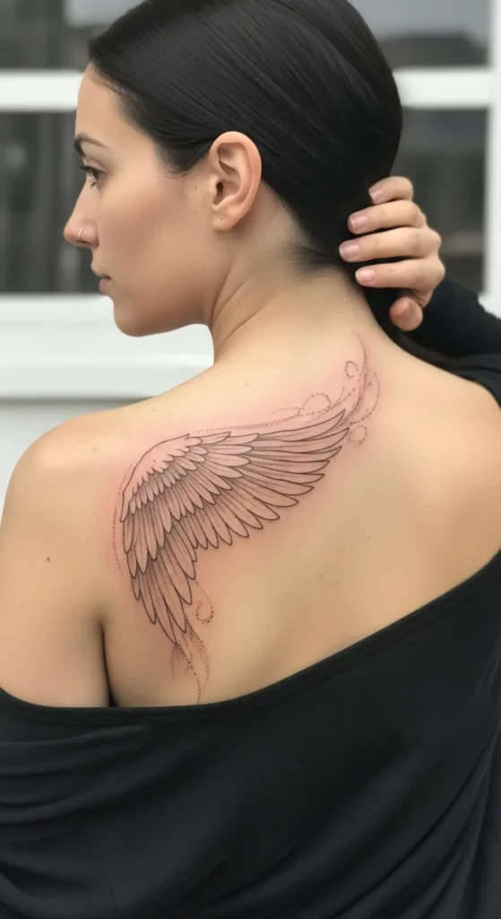 This tattoo is a beautiful example of how to use the shoulder blade and upper back to create a sense of flow. The design features a single angel wing with neatly layered feathers that transition from solid outlines to delicate dotwork at the tips. It is a larger piece that stretches toward the neck and down the arm. It uses a very clean black ink style. What makes it stand out is the trail of tiny dots and swirls that look like a path of stardust or wind blowing through the feathers. It follows the natural curve of the body perfectly.