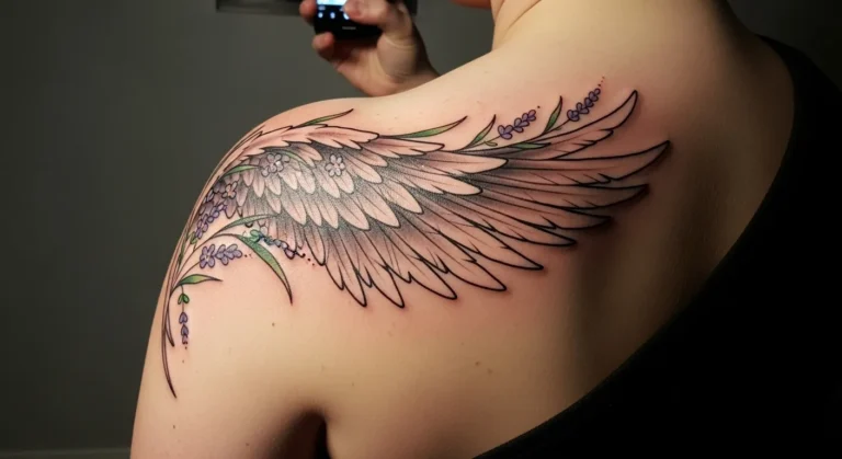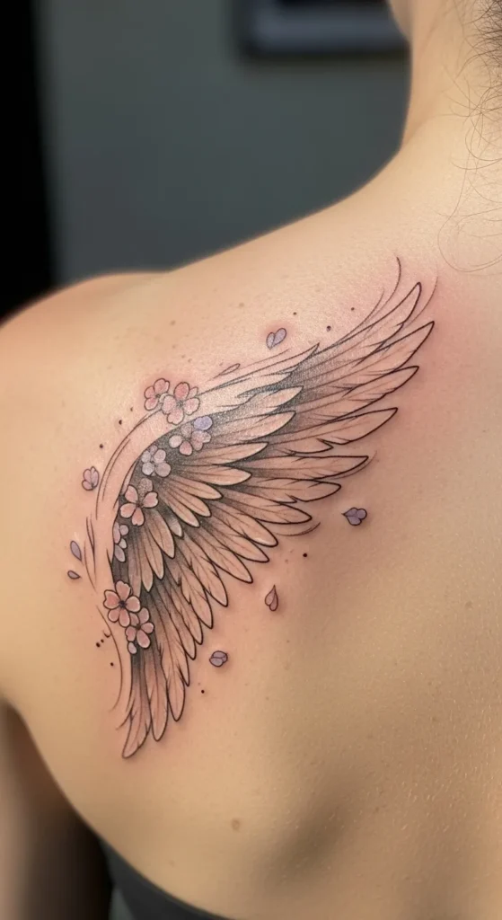 I honestly can’t stop staring at the way those tiny flowers break up the traditional wing shape because it adds such a sweet, personal touch. It reminds me of a fresh spring morning and feels much more unique than a standard wing tattoo. To me, the combination of strength from the wing and the fragility of the falling petals creates a beautiful balance that looks amazing against the skin.