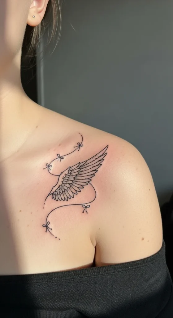 This shoulder design brings a fresh twist to the classic wing by weaving in thin, flowing lines and tiny bows. It lives right on the front of the shoulder and collarbone area, using crisp black ink and very fine linework. The wing itself has a lovely sense of depth with layered feathers and soft shading that makes it pop against the skin. Those little ribbons swirling around the main piece add a playful touch that keeps the whole look feeling light and airy.