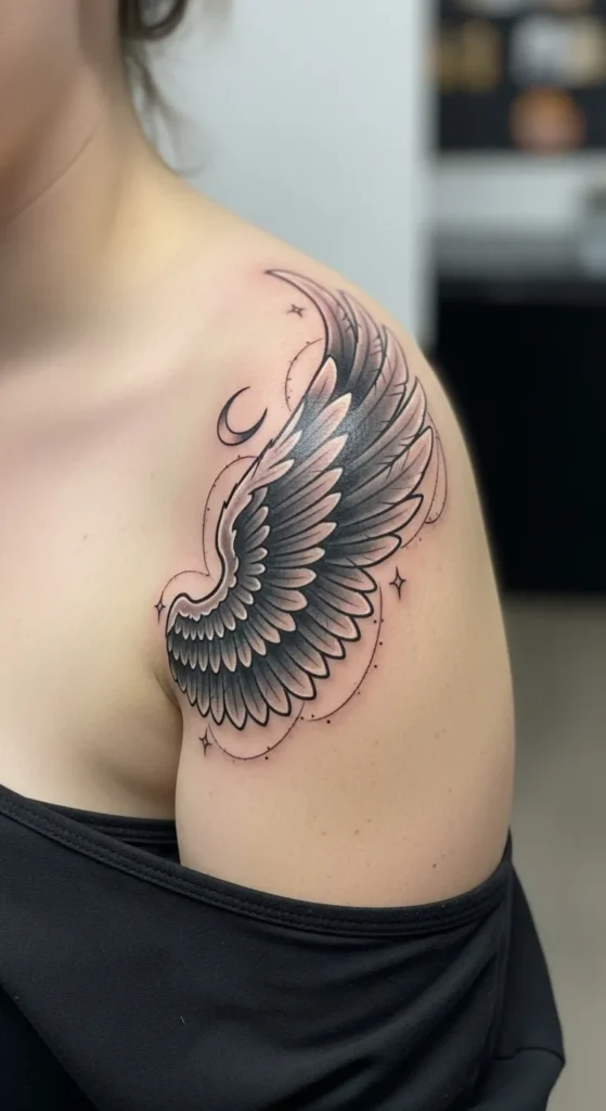 This shoulder piece blends bold shading with delicate linework to create a wing that feels both powerful and light. The deep black ink at the base of the feathers transitions into soft grey gradients as they sweep upward toward the collarbone. Surrounding the main wing are thin circular halos and dainty four-pointed stars that add a touch of cosmic flair. A small crescent moon sits tucked near the top while tiny dots trail along the outer edges to give the whole look a sense of flow and energy. It takes up a good portion of the shoulder cap but stays feminine thanks to those airy extra details.