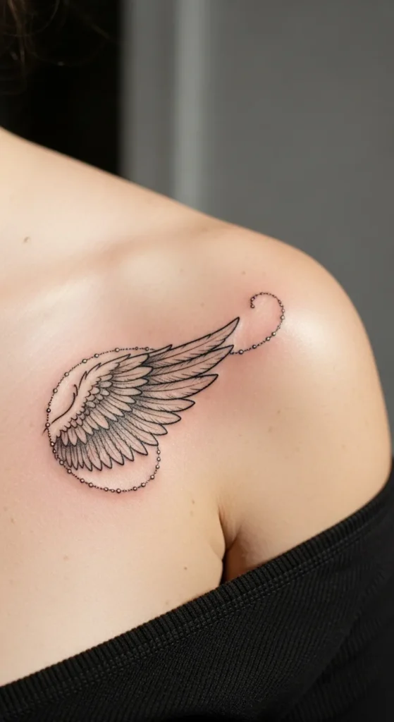This tattoo is a charming example of how delicate linework can transform a classic symbol into something totally fresh. It rests right on the collarbone and front shoulder area, making it super visible whenever you wear a tank top or an off-the-shoulder dress. The piece is relatively small but packed with detail, using black ink and subtle shading to give the feathers a realistic texture. What really sets it apart is the thin string of beads that loops around the wing. It starts near the top and curves around the bottom, ending in a tiny decorative swirl that mimics the movement of the air.