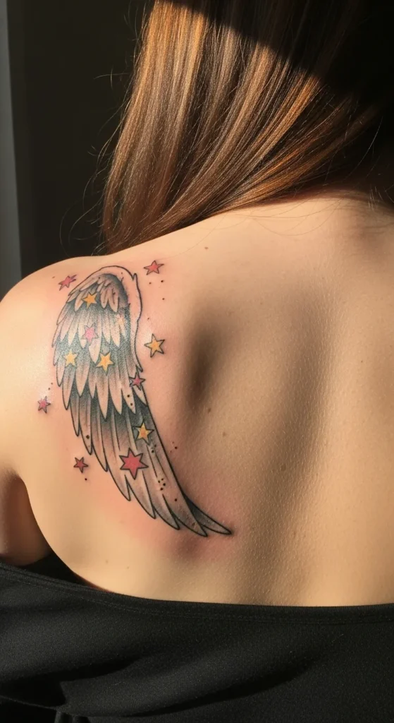This shoulder piece blends a classic angel wing with a playful scattering of colorful stars. The wing follows the natural curve of the shoulder blade and uses soft grey shading to give the feathers a sense of depth and weight. Bright pink and golden yellow stars are tucked into the feathers and float around the edges as if they are drifting in the wind. Tiny black dots accent the clusters of stars to add a little extra sparkle and movement to the overall layout. It is a colorful take on a traditional theme that feels light and full of personality.