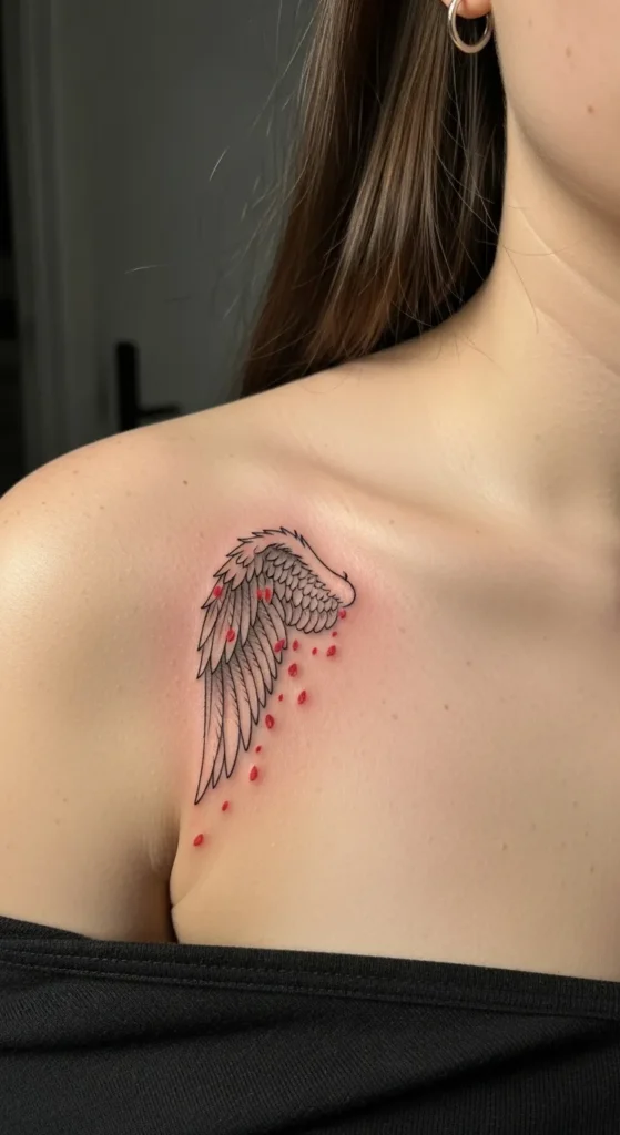 This tattoo rests on the front of the shoulder and collarbone area. It features a single angel wing drawn with crisp black outlines and soft grey shading to give the feathers a realistic depth. Scattered across the wing and drifting down toward the chest are small, vibrant red accents that look like tiny flower petals or droplets. The size is small enough to feel intimate but large enough to catch the eye from across the room. It uses a clean linework approach that emphasizes the sharp tips of the feathers against the soft curve of the skin.