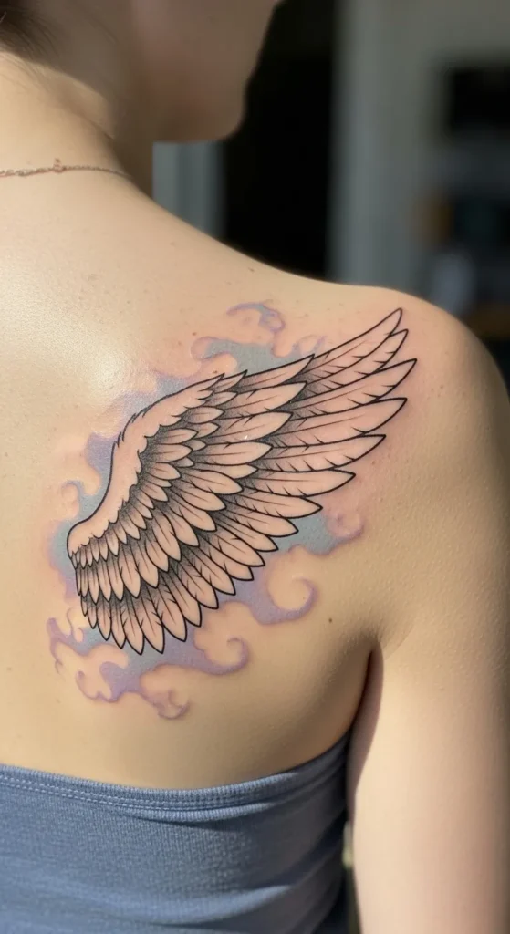This shoulder tattoo combines a bold black outline with a soft splash of color to create a really unique look. The wing itself is quite detailed with clean black ink work that makes every feather pop against the skin. It reaches from the upper back toward the shoulder blade and is surrounded by dreamy swirls of lavender and blue shading. The size is substantial enough to make a statement, but the curved shape follows the natural line of the body, which keeps it looking fluid and integrated.