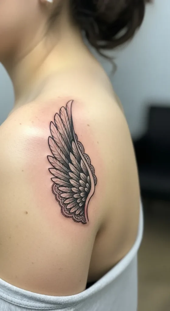 I find that adding lace to a classic wing design makes it feel so much more personal and artistic. It reminds me of a vintage fan or a piece of heirloom fabric, which is why it stands out compared to more traditional wing tattoos. It captures that balance between strength and soft detail that I know a lot of us look for when planning our next bit of ink.