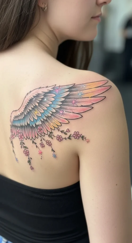 This vibrant shoulder piece stretches across the shoulder blade with a blend of soft rainbow gradients and bold outlines. The wing itself transitions from a dusty rose at the base into icy blues and warm yellow tips. Tiny shimmering stars in pink and gold are sprinkled across the feathers to give it a magical glow. To add a bit of extra flair, delicate pink cherry blossoms and green vines dangle from the bottom of the wing like a decorative charm bracelet. It is a colorful and imaginative take on the classic wing tattoo that covers a good portion of the upper back.