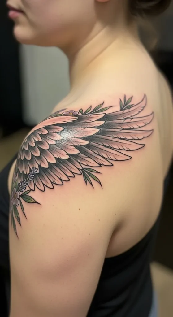 This tattoo wraps beautifully around the top of the shoulder and spills down the upper arm with a mix of bold lines and soft shading. The wing itself uses a pink and grey color palette, which gives it a modern yet classic feel. Tucked into the feathers are tiny purple flowers and green leaves that soften the overall look and make it feel more integrated with the body. The size is substantial enough to make a statement without being overwhelming. It has a lovely flow that follows the natural curve of the shoulder joint perfectly.