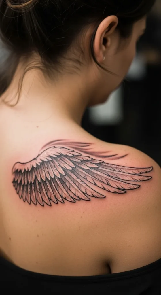 This medium-sized piece rests beautifully across the upper back and shoulder blade. It uses a clean black outline to define the layered feathers, while the inside is packed with a unique glitter effect that gives it a subtle rose gold or pinkish glow. The shading is soft and concentrated near the base of the wing to create depth. You can see thin, wispy lines extending toward the neck, which add a sense of motion as if the wing is ready to flutter. It captures a balance between bold linework and a very soft, feminine sparkle.