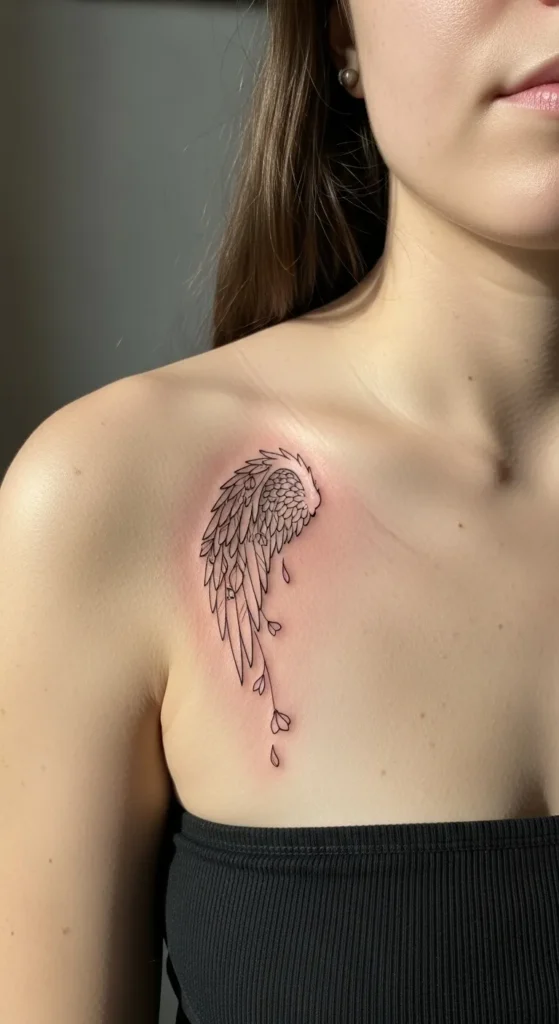This fine-line tattoo sits perfectly on the collarbone area and transitions into the upper chest. It captures a single angel wing in a delicate black ink style that balances detailed feathering with a sense of airy lightness. The size is small to medium and fits the natural curve of the shoulder beautifully. What makes this one stand out are the tiny petals or droplets that seem to be drifting away from the bottom of the wing. It creates a soft trail of movement that draws the eye downward without feeling heavy or cluttered.