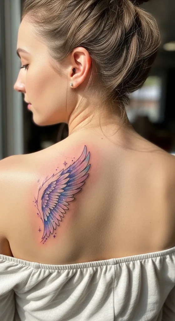 Some of my favorite angel wing tattoos combine soft pastels, tiny stars, or subtle dots to make the feathers feel alive.