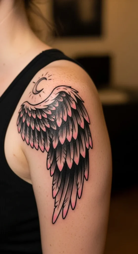 This shoulder piece blends bold traditional lines with a modern, feminine flair. Resting right on the outer deltoid, the design showcases a sweeping wing with dark, saturated feathers that transition into soft pink tips. The shading is smooth and heavy, giving the wing a physical weight that feels grounded. Sitting just above the wing is a simple crescent moon with radiating lines, adding a touch of cosmic energy to the anatomy. It is a medium size that fills the shoulder space perfectly without feeling crowded, using that pop of coral pink to keep the look bright and punchy.