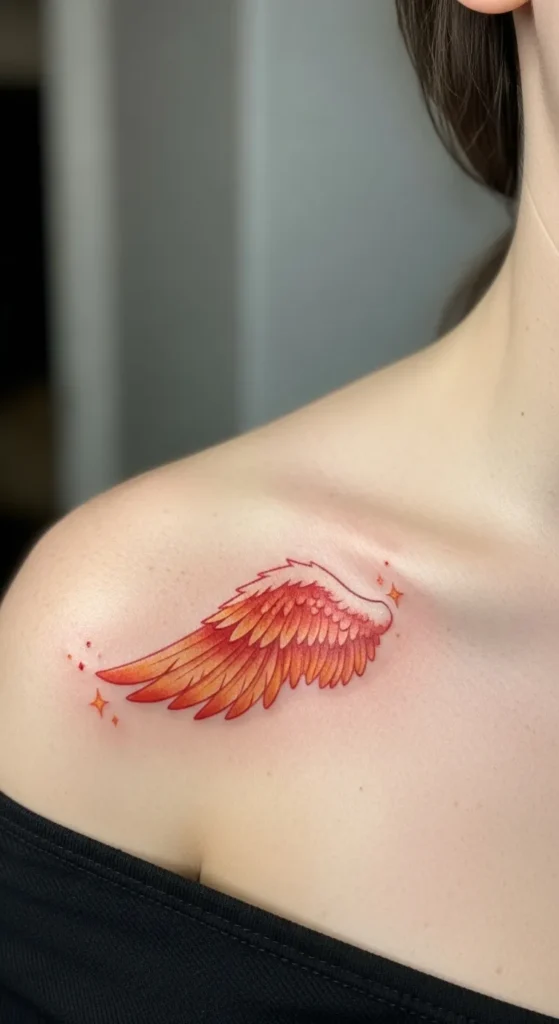 This tattoo showcases a vibrant wing tucked just below the collarbone and extending toward the shoulder. The piece uses a rich sunset palette with bold orange and red gradients that give the feathers a warm, glowing effect. Small red sparkles and four-pointed stars float around the edges to give it a magical vibe. The linework is delicate but well defined, with the saturated colors doing most of the heavy lifting to create depth and movement. It is a smaller design that packs a punch through its vivid tones and clever placement that follows the natural curve of the body.