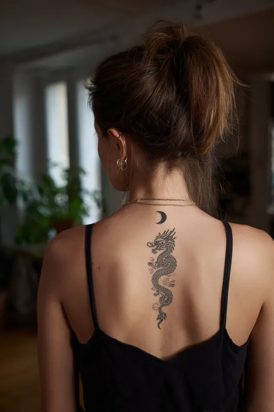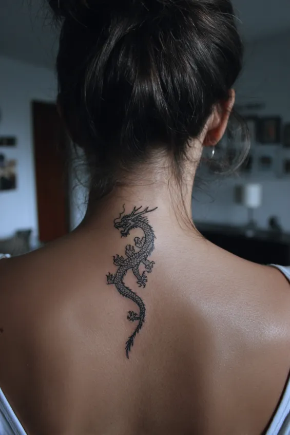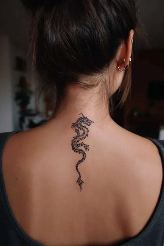 The tattoo is a smaller black dragon placed neatly along the upper spine. It has clean linework with subtle shading and a simple, graceful curve. The size keeps it refined and easy to style with different outfits, especially open back tops.