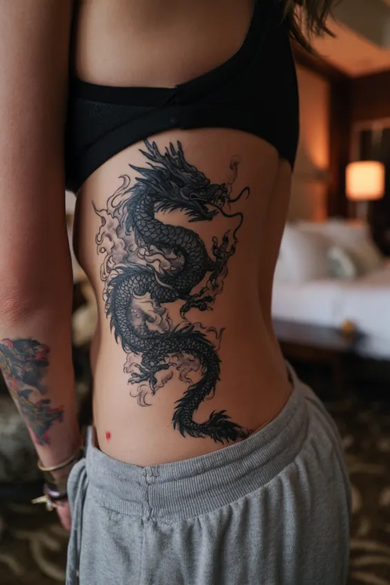 The design shifts slightly off center and wraps along the side of the spine and rib area. This dragon is medium to large with rich black and grey shading, detailed scales, and a dramatic pose. The curve of the body hugs the waistline, creating a stunning hourglass effect that highlights natural curves in the most flattering way.