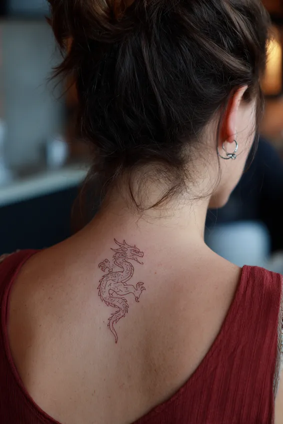 The tattoo introduces a soft blush toned dragon inked lightly along the upper back. The lines are delicate and slightly faded in appearance, giving it a gentle and romantic feel. The size is small to medium, and it sits just below the nape, following the spine in a subtle curve.