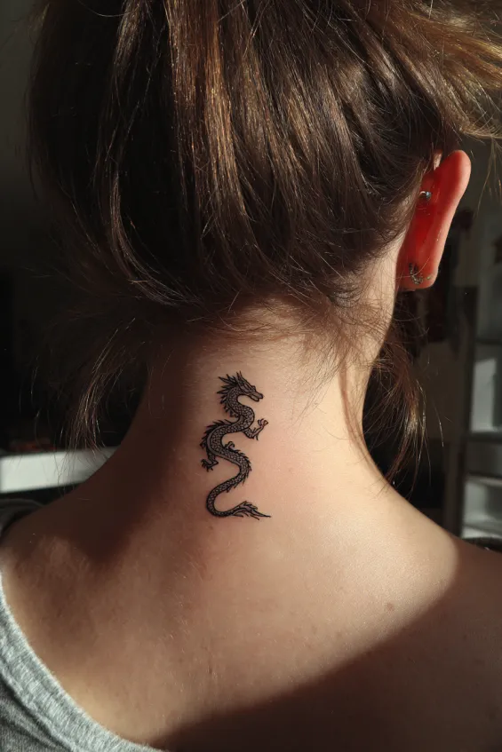 The tattoo is a very small black dragon placed right at the nape of the neck, just touching the top of the spine. The linework is simple and slightly thicker than fine line, with a compact curled body. It feels neat and intentional, almost like a small emblem.