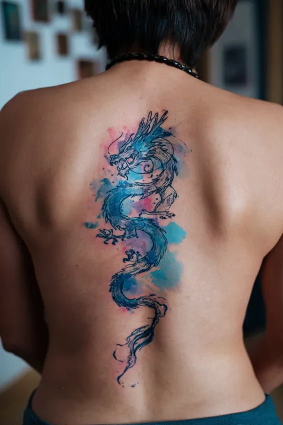 The tattoo brings in vibrant watercolor tones, mainly blues and hints of pink, flowing down the spine in a fluid motion. The dragon looks almost like it is painted onto the skin, with soft splashes of color blending into the background. The size is medium to large, and the body curves gracefully from the upper back down toward the lower spine.