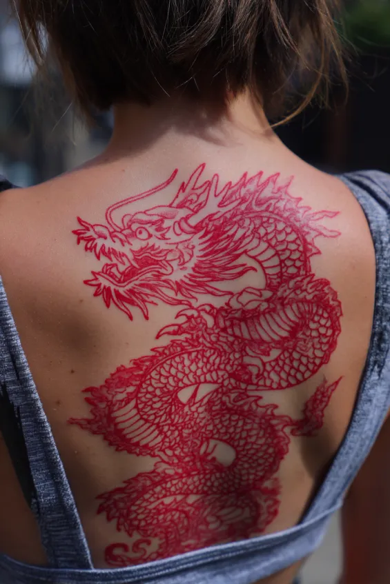 The tattoo showcases a bright red dragon that covers most of the upper and mid back along the spine. The lines are crisp and the body coils dramatically, filling the space with confident energy. The red ink makes it instantly eye catching, especially against bare skin.