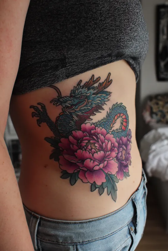 This medium to large rib tattoo blends a detailed dragon with a blooming peony in rich pink and red tones. The dragon’s body curves protectively around the flower, with teal and deep green accents adding dimension to the scales. Placed along the side ribs, the composition fills the space beautifully without looking crowded.