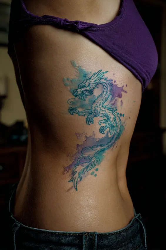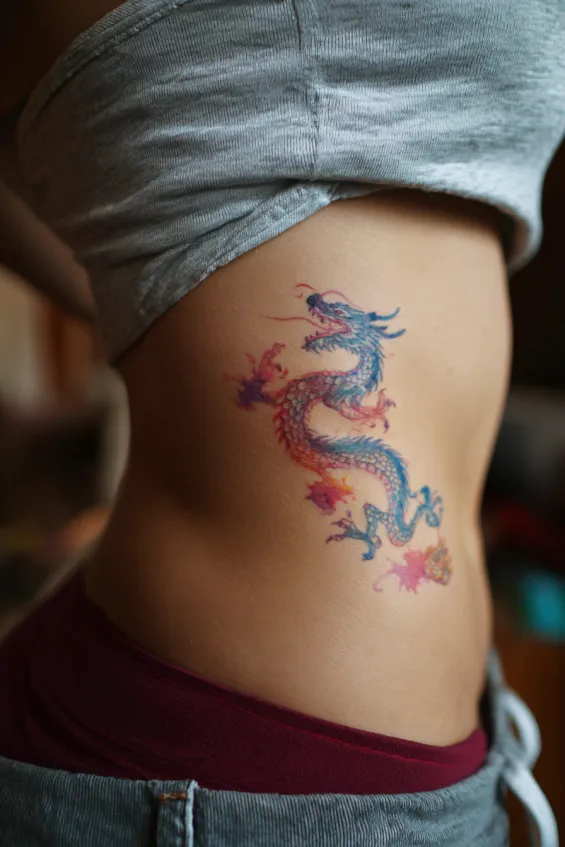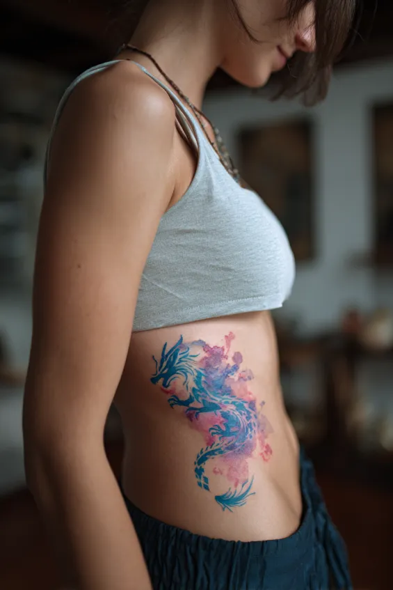 This medium rib tattoo showcases a dragon painted in soft pastel shades of pink, blue, and lavender. The watercolor effect creates a dreamy look, with gentle blending that melts into the skin. The dragon’s body curves vertically along the ribs, keeping the placement feminine and fluid.