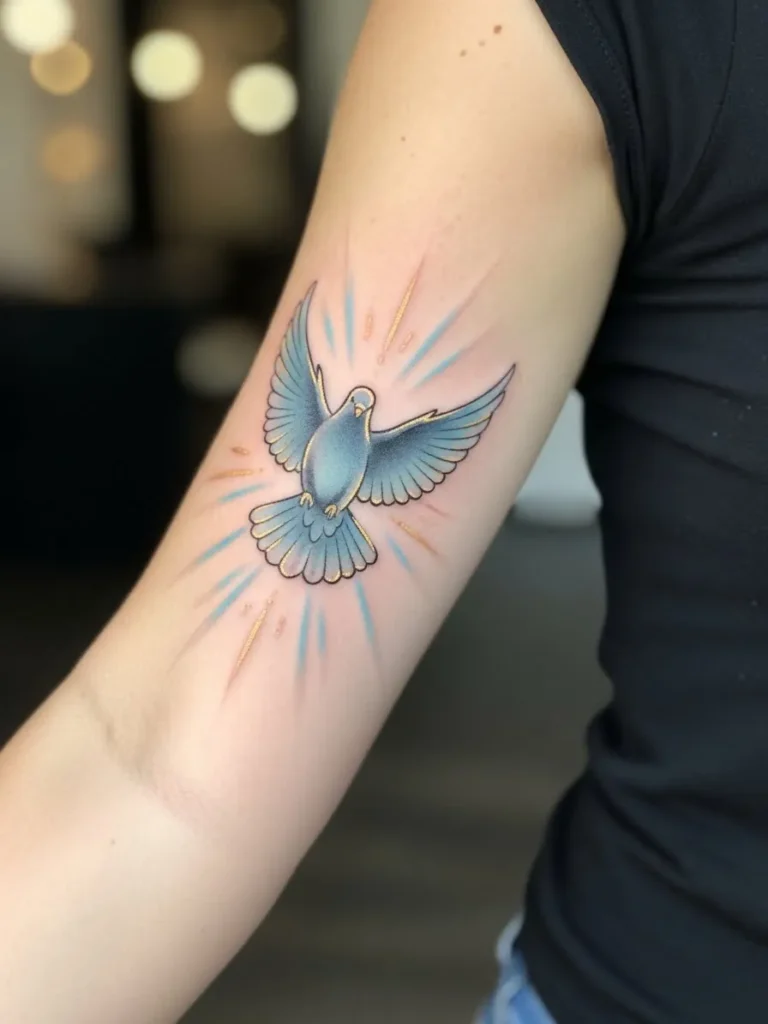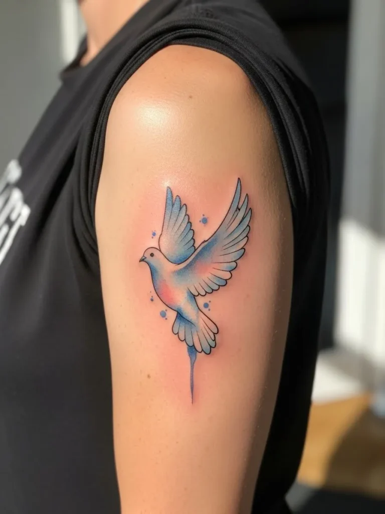 This tattoo is placed on the outer upper arm and features a dove in flight done in a soft illustrative style. Gentle blues and muted peach tones give the wings warmth and movement, while clean linework keeps the design fresh and modern. The size is medium, letting the dove feel expressive without overpowering the arm.