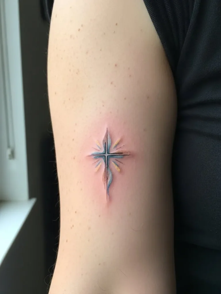 Sitting on the inner arm, this tattoo shows a small fine line cross with a subtle watercolor glow in pastel blue and soft pink. The clean lines keep it modern, while the color adds warmth and dimension. The size is small, perfect for a delicate and personal placement.
