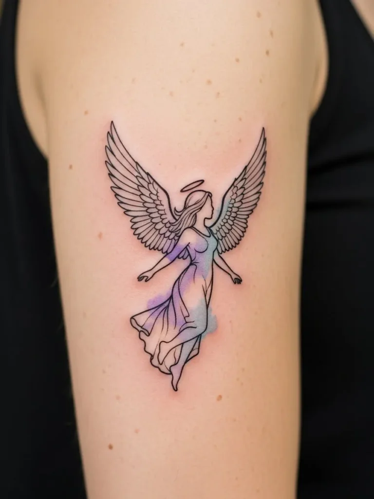Positioned on the outer upper arm, this tattoo shows a graceful angel with wings spread wide, illustrated in fine lines with soft lavender and blue shading. The medium size gives it presence, while the clean style keeps it modern and elegant.