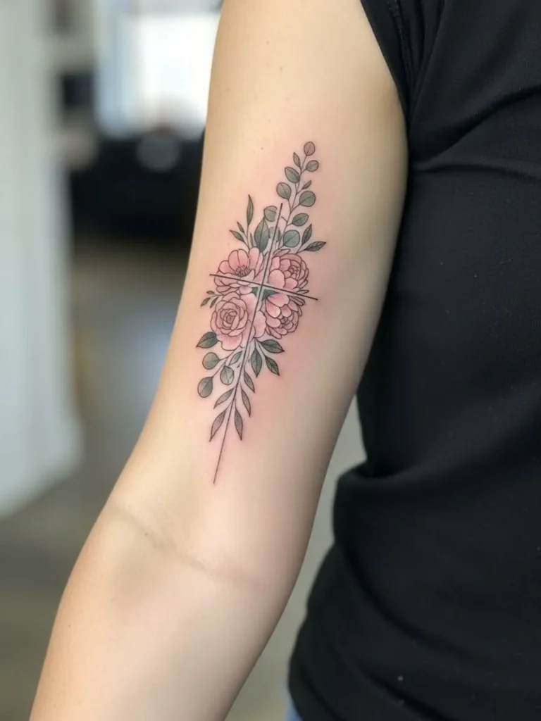 This tattoo sits on the outer arm and features a floral arrangement done in fine line style with soft pink blossoms and muted green leaves. The medium size and vertical flow make it feel balanced and feminine, with a fresh and gentle look.