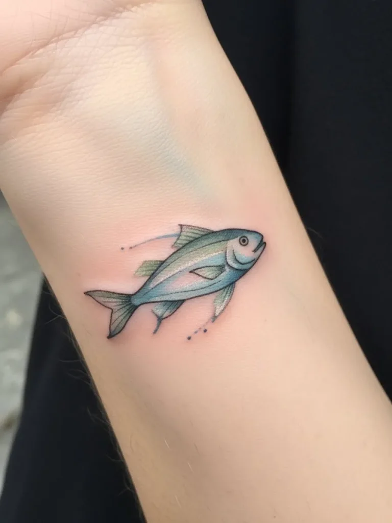 Placed on the inner forearm, this tattoo features a fish symbol illustrated in soft blue and gray tones with clean linework. The medium size makes it noticeable but still refined, keeping the overall look fresh and modern.