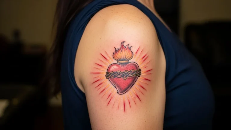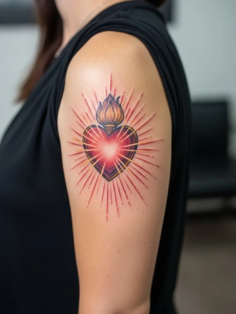 This tattoo is positioned on the outer upper arm and shows a Sacred Heart surrounded by radiant lines in warm reds and golden tones. The medium to large size gives it strong presence, while the clean execution keeps it polished and balanced.