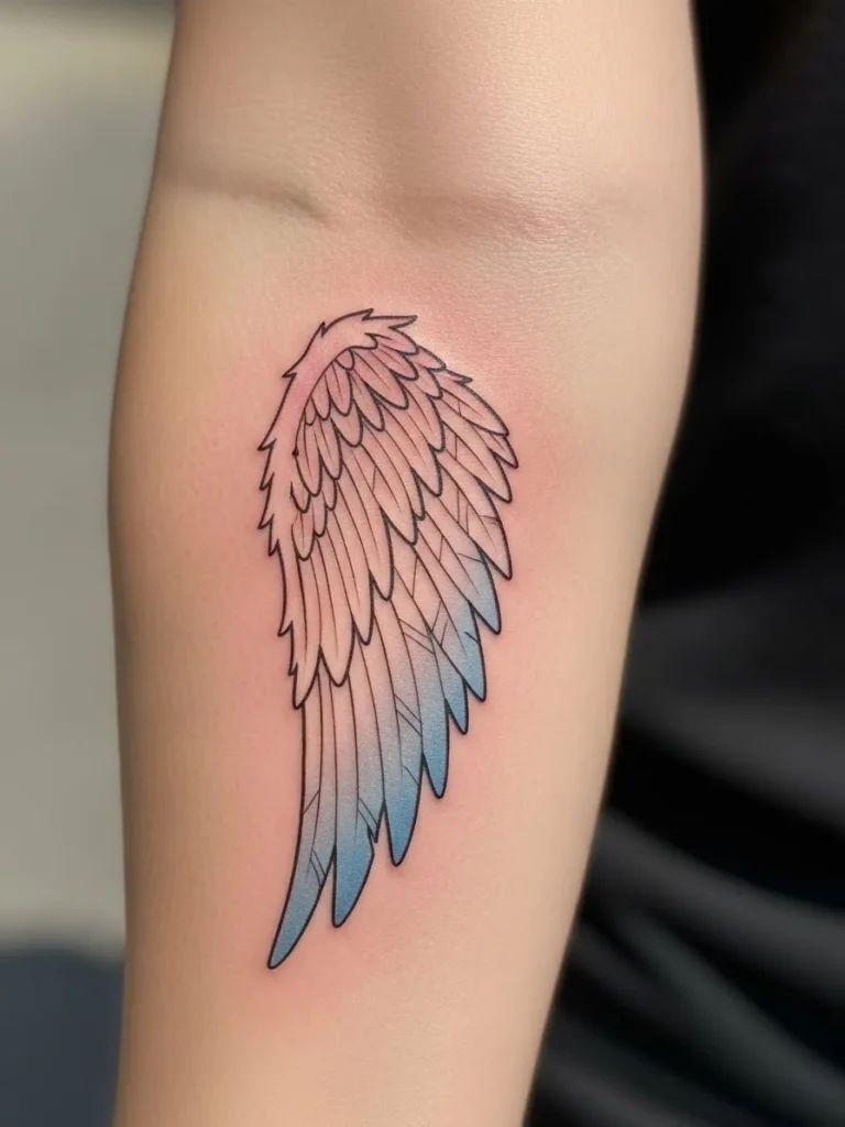 Sitting on the outer arm, this tattoo features a single angel wing with a soft gradient fade from peach to light blue. Fine line feather details keep it structured, while the medium size lets the colors really shine.