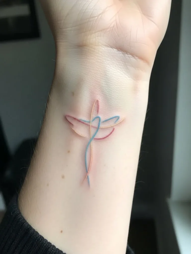 This tattoo sits on the inner wrist and features a fine line cross paired with delicate wing shapes extending outward. Soft pastel blues and blush tones add a light watercolor feel, while the overall size stays small and intimate. The clean lines and subtle color keep it fresh, airy, and very wearable.
