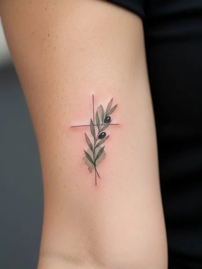 Placed on the inner arm, this tattoo features a slim olive branch done in fine line style with muted green leaves and soft brown stems. The size is small to medium, making it subtle and very wearable, with a clean and peaceful overall look.