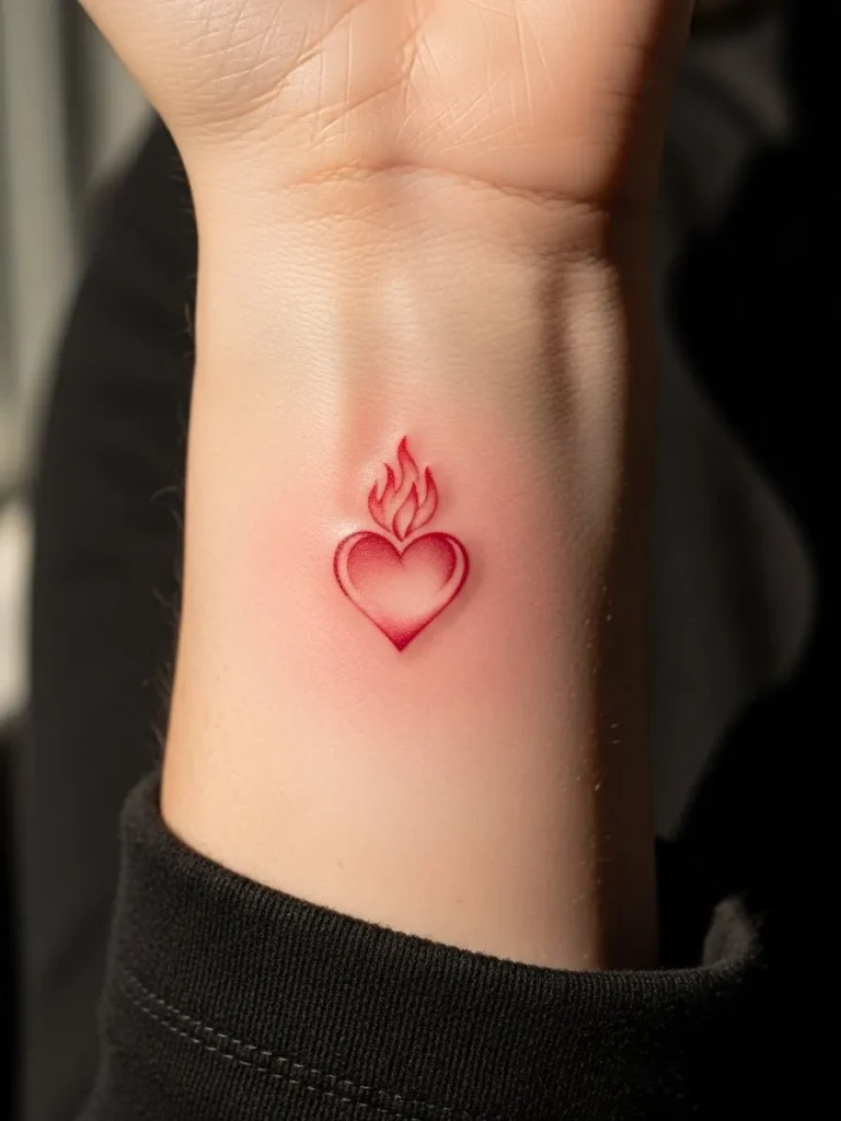 This tattoo sits on the inner wrist and features a small Sacred Heart topped with a flame, done in soft red and blush tones. The fine line style keeps it clean and modern, while the color gives it warmth and emotion. The size makes it feel very personal.