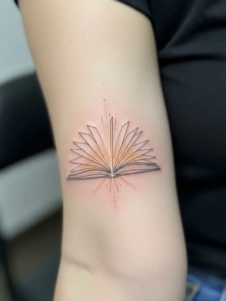 This tattoo sits on the inner arm and shows an open Bible with fine line pages and soft golden rays spreading upward. Subtle beige and warm yellow tones keep the design gentle and modern, with a medium size that feels calm and balanced on the arm.