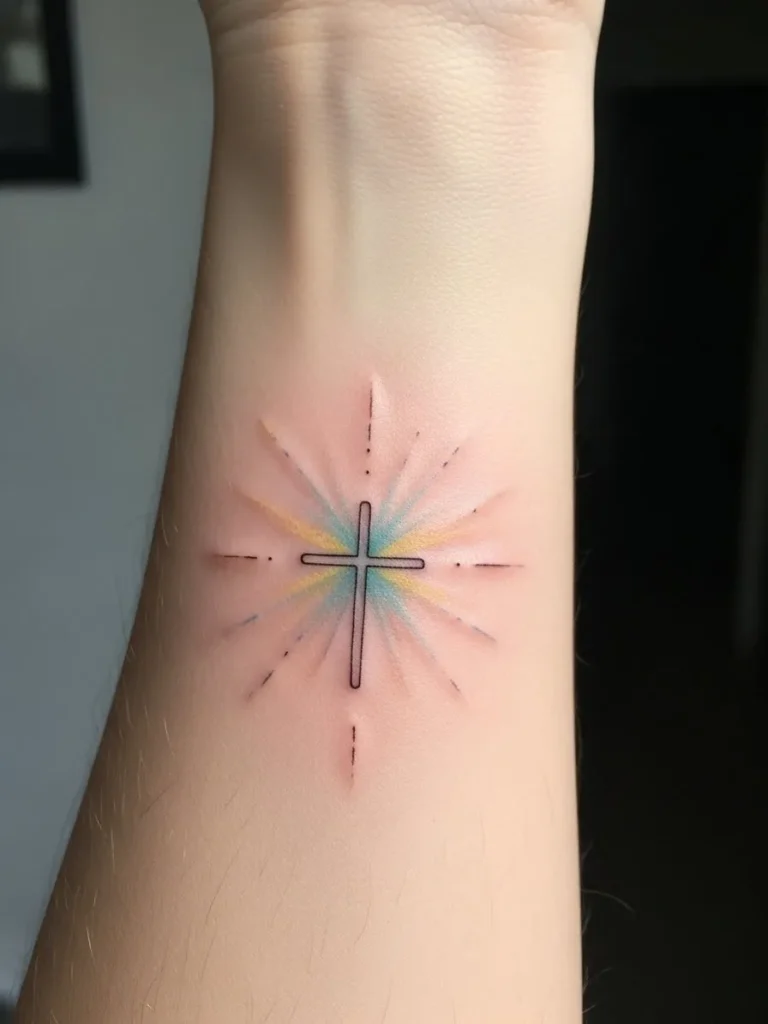 This tattoo is placed on the inner forearm and features a fine line cross surrounded by soft radiating lines in pastel pink and warm beige. The size is small to medium, keeping it delicate but expressive, with a clean modern look.