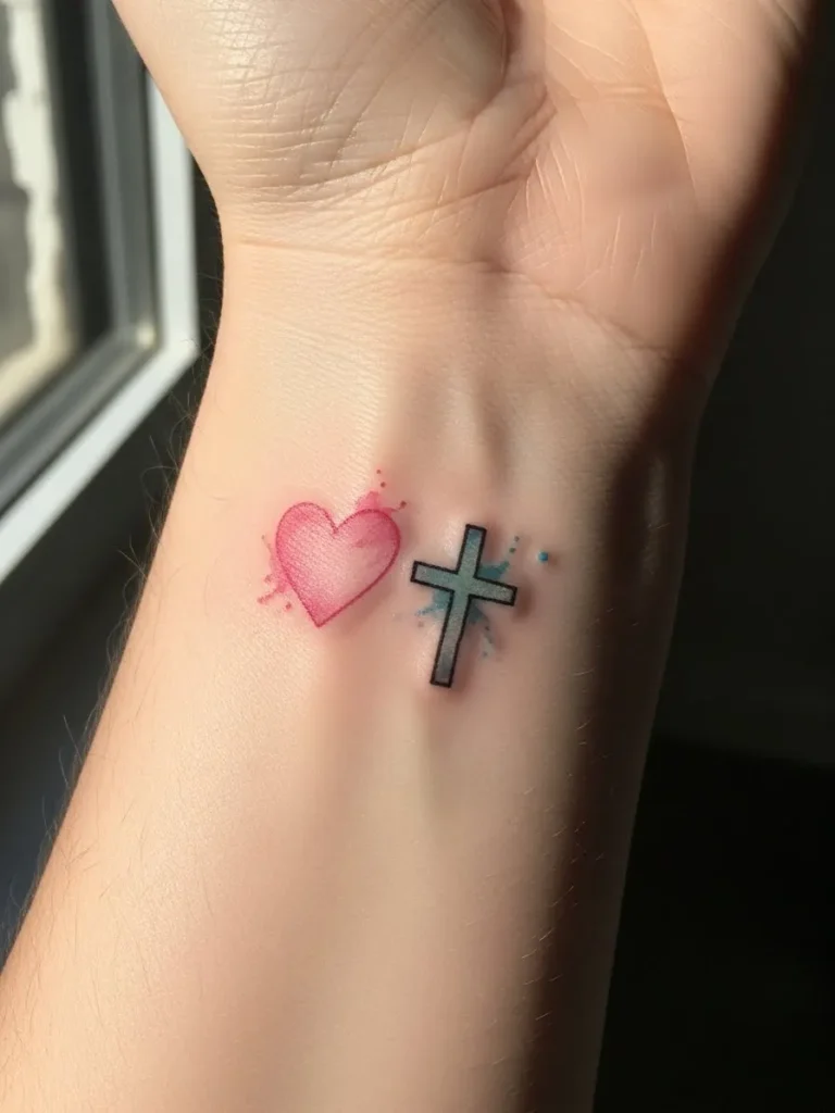 This small tattoo sits on the inner wrist and combines a soft pink heart with a simple black cross. The clean lines and delicate color palette keep it modern and sweet, with just enough detail to feel meaningful without being bold.