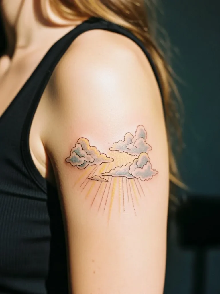 This tattoo is placed on the outer upper arm and features soft clouds with warm light breaking through in pastel yellows and gentle neutrals. The illustrative style keeps it dreamy, while the medium size allows the scene to unfold beautifully on the arm.