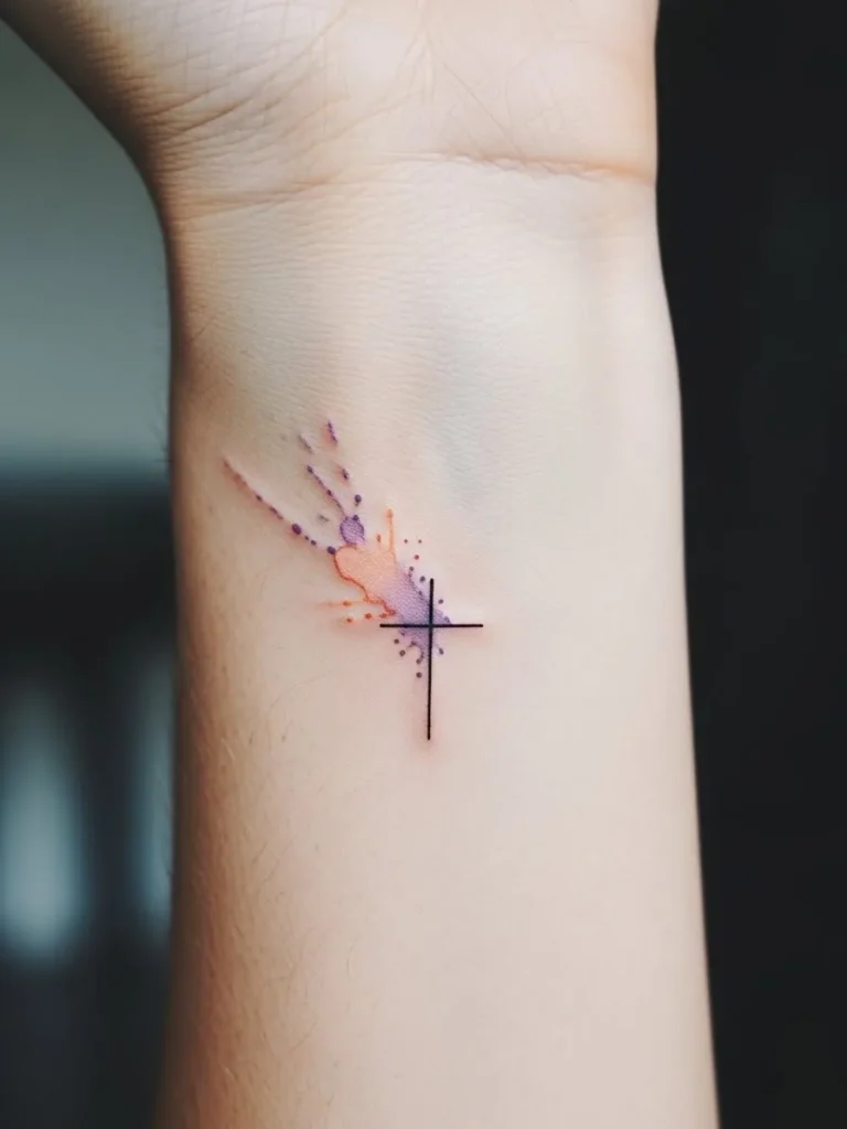 This tattoo sits on the inner wrist and features a fine line cross with soft watercolor splashes in lavender and peach tones. The size is small, keeping it delicate and modern, while the color adds emotion and personality.